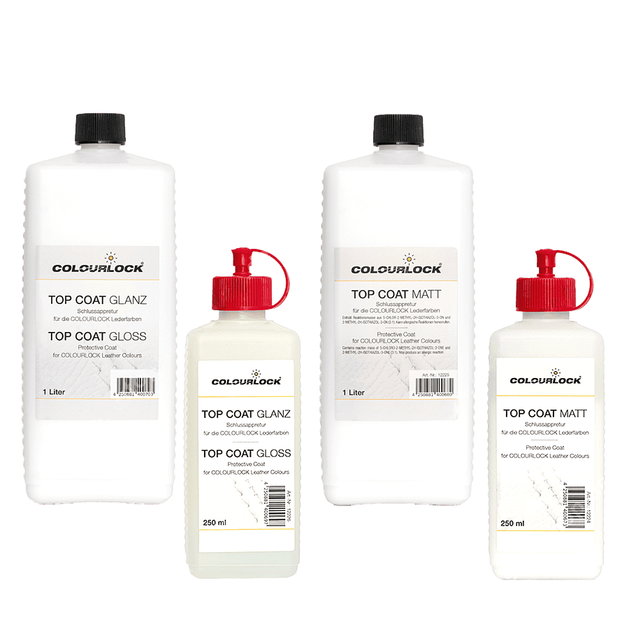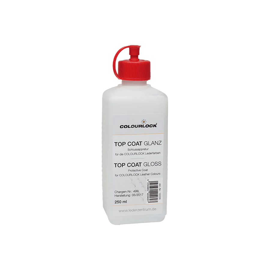 Верхнее покрытие COLOURLOCK Top Coat Glanz, запечатывает и закрепляет окрашенную поверхность. Оно придает поверхности кожи защитную изоляцию от воды и грязи, делая ее более устойчивой к общему износу. Верхнее покрытие доступно в версиях «Матовое» Matt, «Глянцевое» Gloss , «Высокоглянцевое» Brillant и «Транспорт, Мебель, Винил» Vehicle, Furniture and Vinyl. Все версии можно смешивать друг с другом для получения оригинального оттенка.