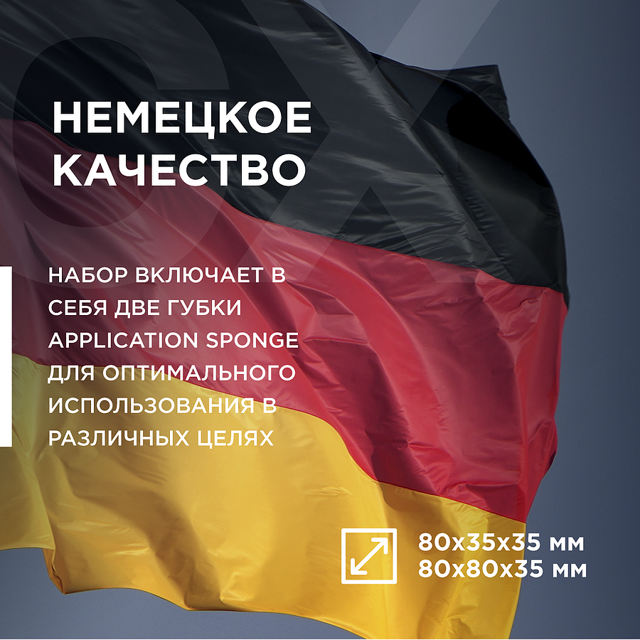 Набор включает в себя две губки Application sponge для нанесения составов с замшевым покрытием. Для оптимального использования в различных целях в набор включены две губки разных размеров (80x35x35 мм и 80x80x35 мм). Защитный барьер между поролоновым основанием и замшевым покрытием препятствует проникновению защитного состава в поролоновое основание, благодаря чему расходуется меньше материала. Полное покрытие из высококачественной микрофибры идеально прилегает к контуру обрабатываемой поверхности благодаря мягкому поролоновому основанию. Это способствует быстрому и простому нанесению.