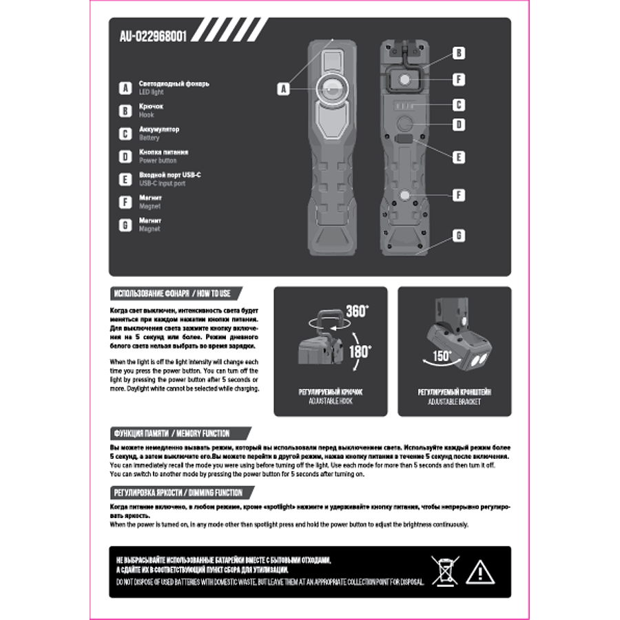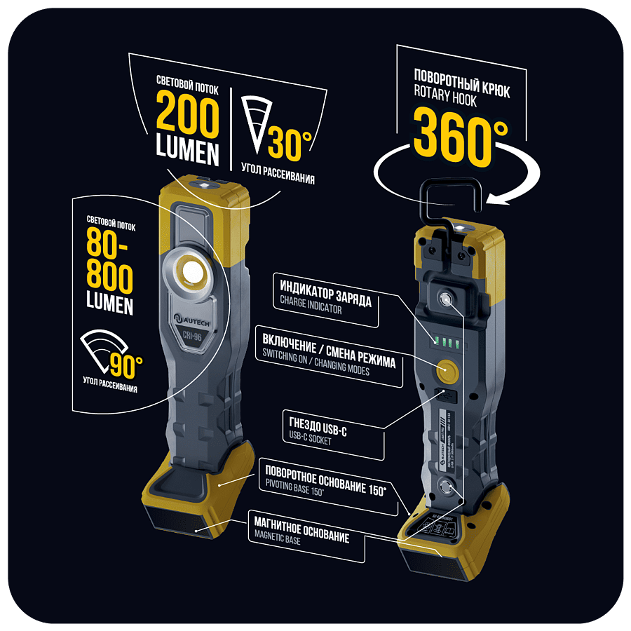 Оснащён магнитным держателем, который позволяет использовать его закрепив на металлической поверхности. Благодяря шарнирному соединению появляется возможность наклонять фонарь. Диапазон шарнирного соединения 150°