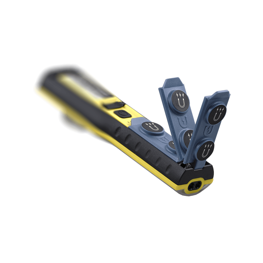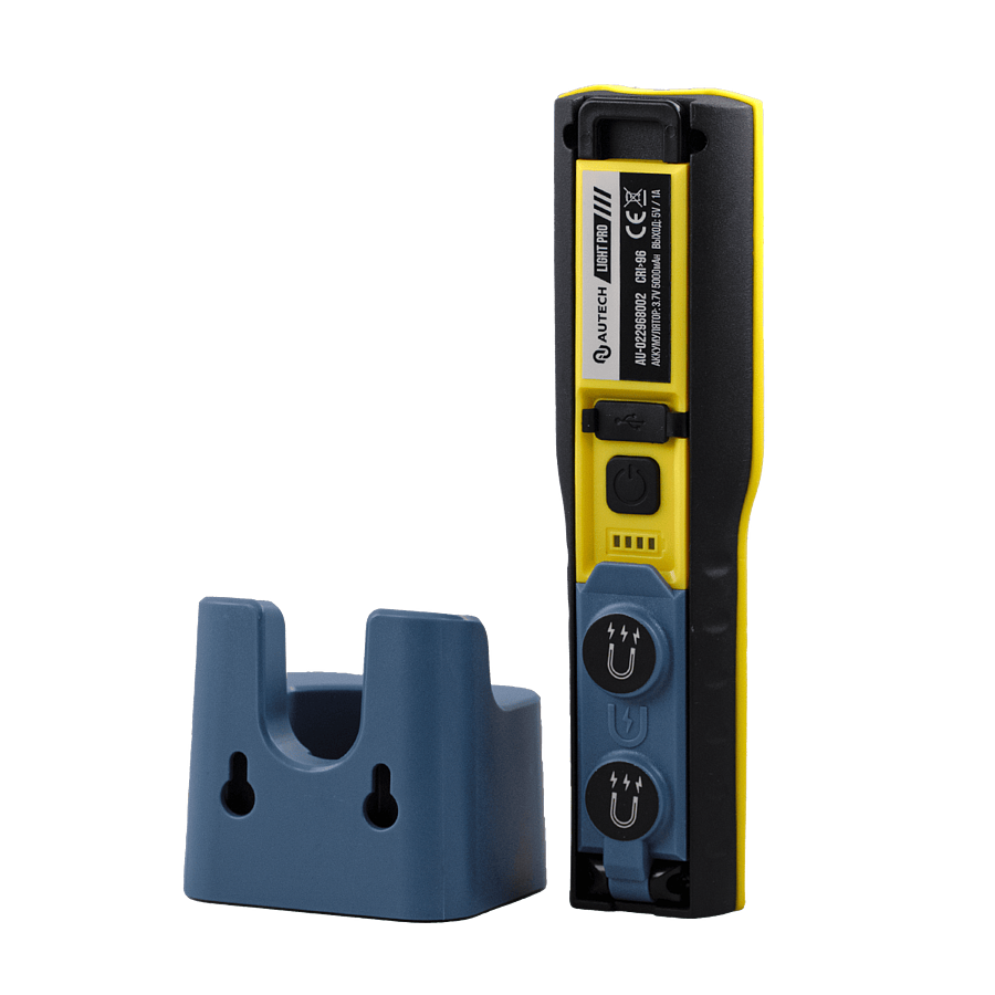Оснащён магнитным держателем, который позволяет использовать его закрепив на металлической поверхности. Благодяря шарнирному соединению появляется возможность наклонять фонарь. Диапазон шарнирного соединения 90°