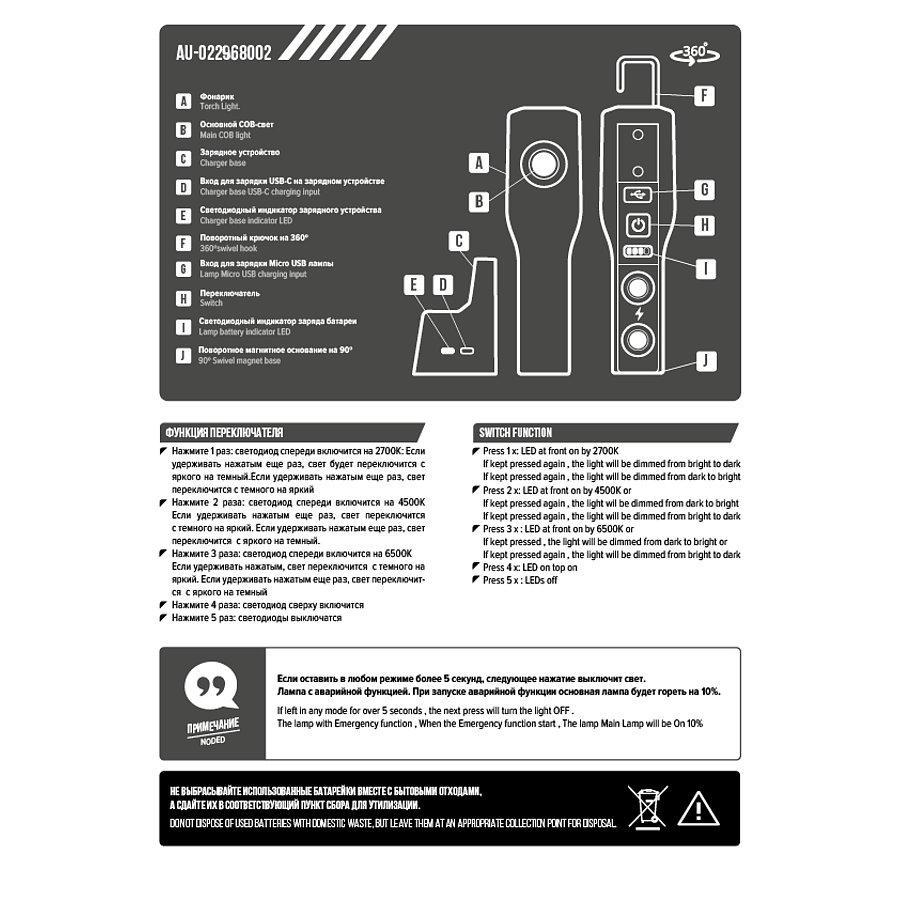 Комплект поставки: Фонарь, зарядное устройство, инструкция