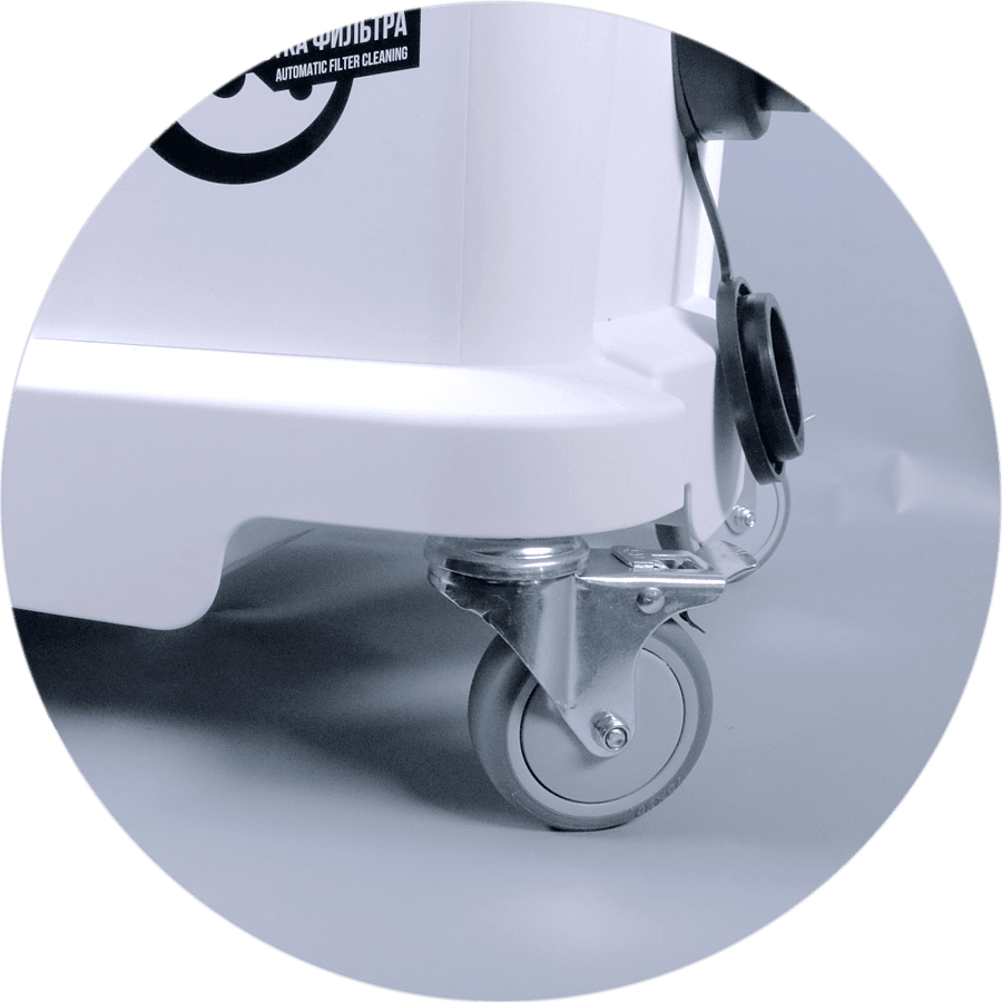 Поворотные колёса позволяют добиться мобильности при перемещении пылесоса. Бак из пластика 40 л. не подвержен коррозии. Увеличенный срок службы. Широкий диапазон применения от хозяйственных нужд до промышленного производства. Пылесос оснащён системой автоматической очистки фильтра. Автоматическая очистка фильтра происходит путём встряхивания за счёт применения электромагнитов.