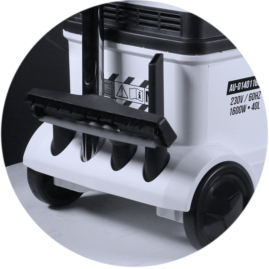 Поворотные колёса позволяют добиться мобильности при перемещении пылесоса. Бак из пластика 40л. не подвержен коррозии. Увеличенный срок службы. Широкий диапазон применения от хозяйственных нужд до промышленного производства. Пылесос оснащён системой автоматической очистки фильтра. Автоматическая очистка фильтра происходит путём встряхивания за счёт применения электромагнитов. Пылесос оснащён пневмолинией, позволяющей обеспечить подключение пневмоинструмента непосредственно через пылесос.