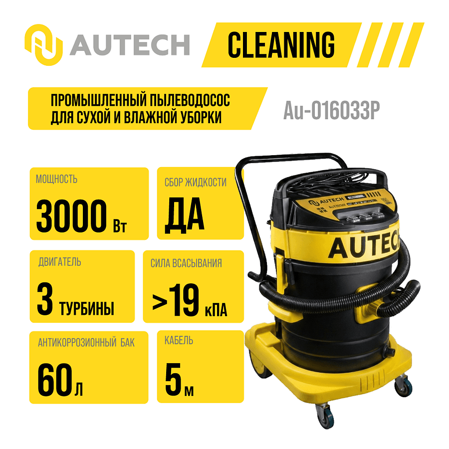 Промышленный пылеводосос 3 турбины для влажной и сухой уборки, мощность -3300 Вт., 60л. антикоррозионный бак Au-016033P