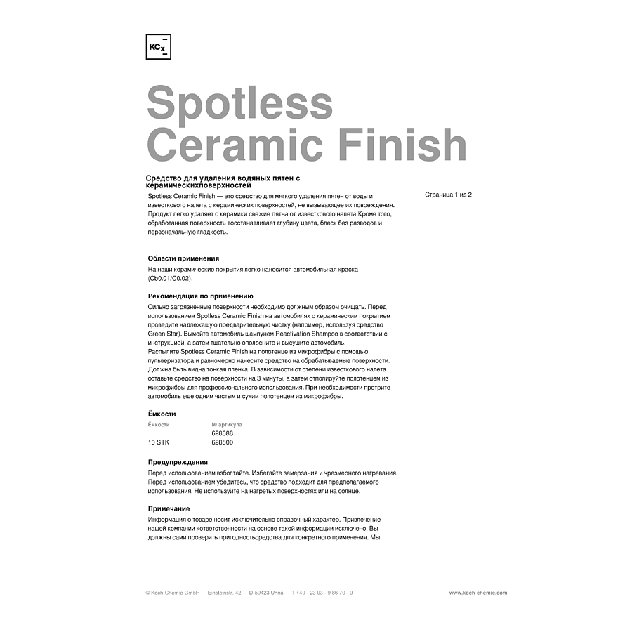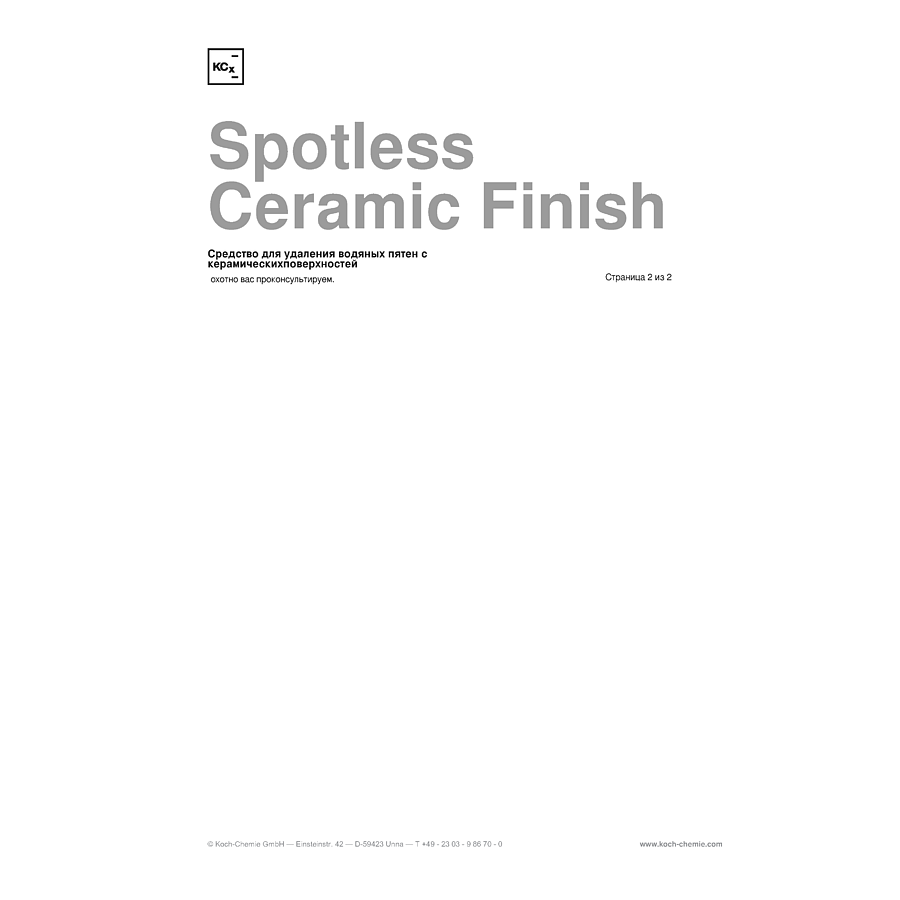 Spotless Ceramic Finish — инновационный очиститель, разработанный для бережного ухода за керамическими покрытиями. Продукт легко удаляет с керамики свежие пятна от известкового налета. Кроме того, обработанная поверхность восстанавливает глубину цвета, блеск без разводов и первоначальную гладкость.