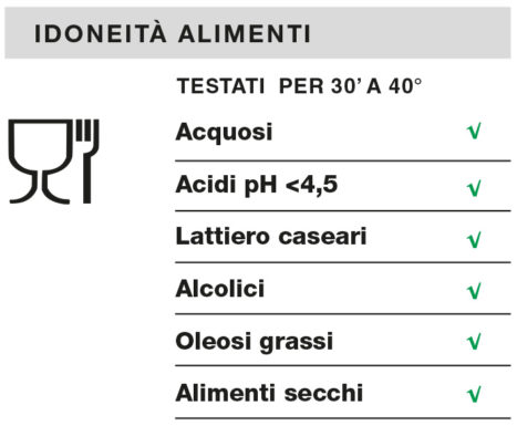 MOCA Подходит для контакта с различными типами продуктов питания (в соответствии с Директивой 2002/72 / EEC, DM 21.3.1973, Рег. 2004/1935 / CEE и Рег. ЕС 10/2011 и последующими обновлениями)