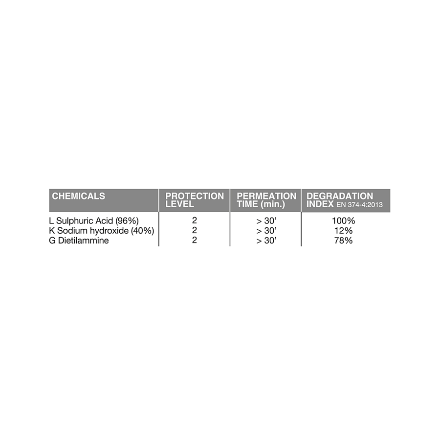 EN ISO 374-1:2016 / TYPE B: сертифицированно для 3 химических продуктов.